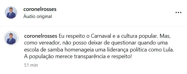 Rosses declarou não ser contrário à festa popular, mas questionou o que considera uso político de eventos financiados com recursos públicos. Segundo o vereador, a exaltação ao presidente em escolas que recebem verba governamental merece debate e fiscalização.