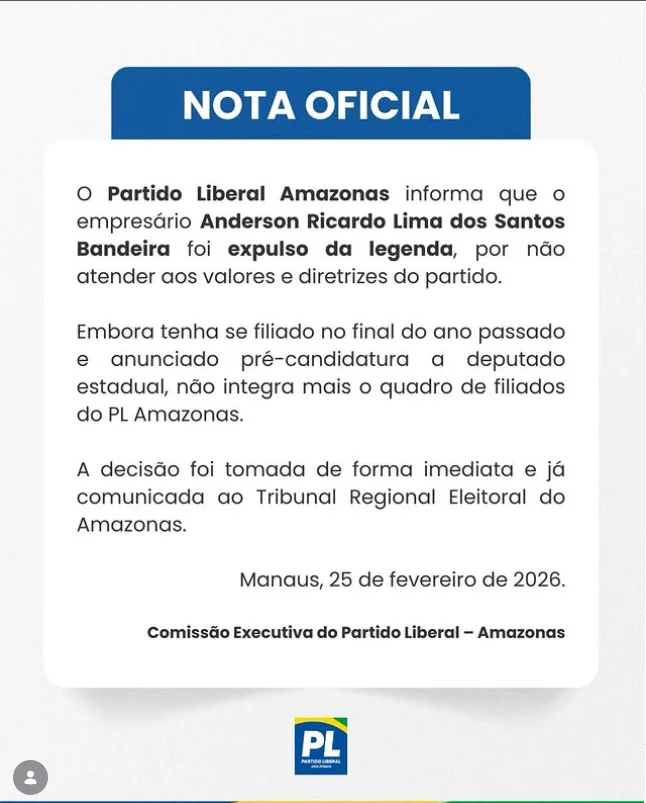 Antes da operação, Anderson Bandeira havia anunciado pré-candidatura a deputado estadual e participava de agendas públicas ligadas ao Partido Liberal no Amazonas.