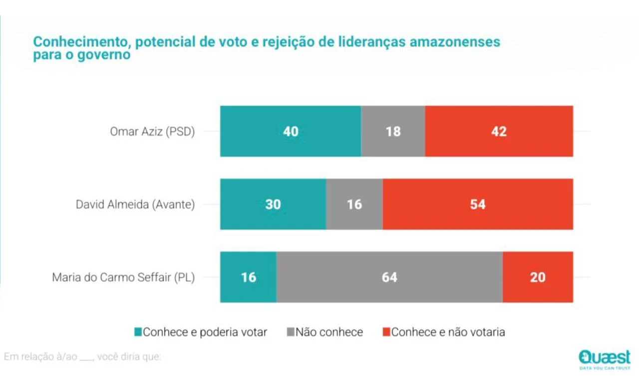A nova pesquisa Quaest sobre a disputa pelo Governo do Amazonas reforça um dado político relevante para 2026: os nomes mais conhecidos da corrida também são, hoje, os que enfrentam os maiores índices de rejeição. No recorte de conhecimento, potencial de voto e rejeição, Omar Aziz (PSD) aparece com 40% dos entrevistados dizendo que o conhecem e poderiam votar nele, 18% afirmando não conhecê-lo e 42% declarando que o conhecem, mas não votariam. David Almeida (Avante), por sua vez, registra 30% de potencial de voto, 16% de desconhecimento e 54% de rejeição. Já Maria do Carmo Seffair (PL) tem 16% de potencial de voto, 64% de desconhecimento e 20% de rejeição.