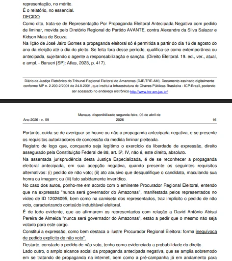 O Tribunal Regional Eleitoral do Amazonas (TRE-AM) enviou um recado claro ao cenário político nesta semana: a liberdade de expressão não será salvo-conduto para ataques eleitorais fora do prazo legal. Duas decisões recentes, publicadas no Diário da Justiça Eletrônico, expõem o rigor da Corte no combate à propaganda antecipada negativa e na efetivação de sanções financeiras contra parlamentares.