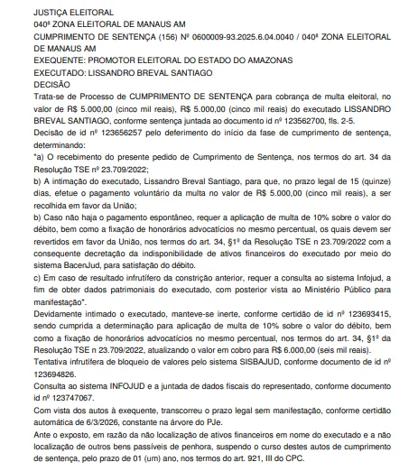 Em outra frente, a 40ª Zona Eleitoral de Manaus endureceu a cobrança contra o vereador Lissandro Breval. Condenado inicialmente ao pagamento de uma multa eleitoral de R$ 5 mil, o parlamentar não efetuou o depósito no prazo legal, o que gerou acréscimos de 10% e honorários, elevando a dívida para R$ 6 mil.