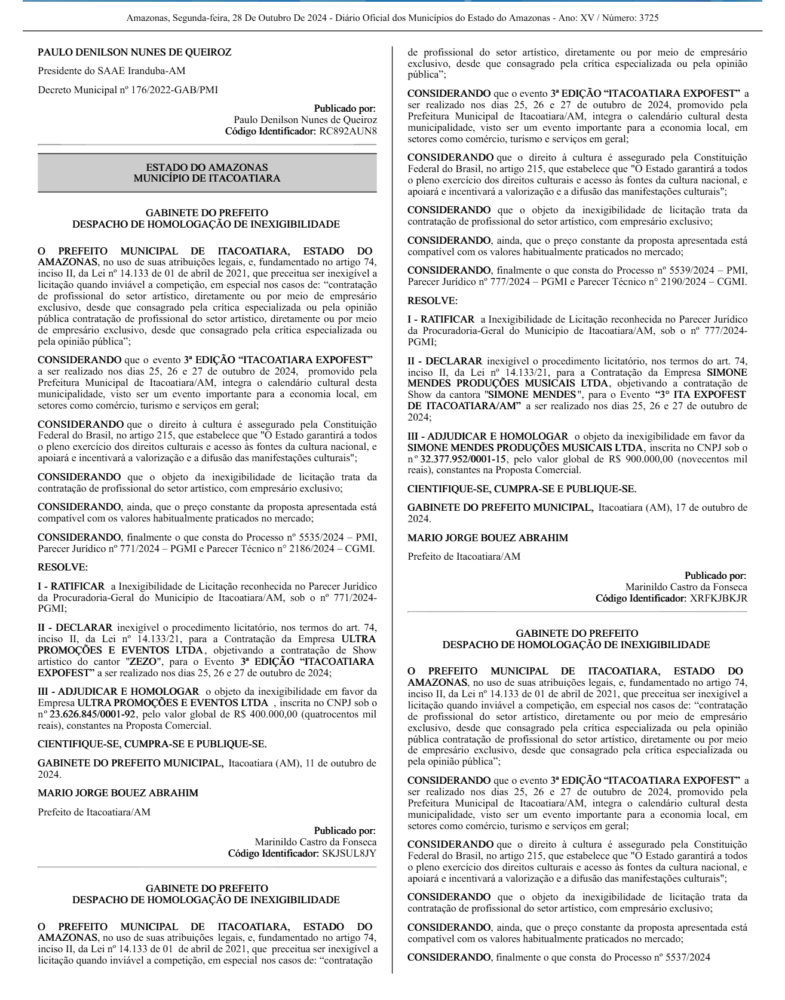 A divulgação dos valores foi feita no Diário Oficial dos Municípios (DOM) do Amazonas nesta segunda-feira (28/10), um dia após o encerramento do evento, com todos os contratos assinados pelo prefeito Mário Abrahim (Republicanos). A contratação sem licitação foi justificada pela “inexigibilidade”, permitindo o processo direto por meio de empresários exclusivos dos artistas, segundo a Lei 14.133/2021.