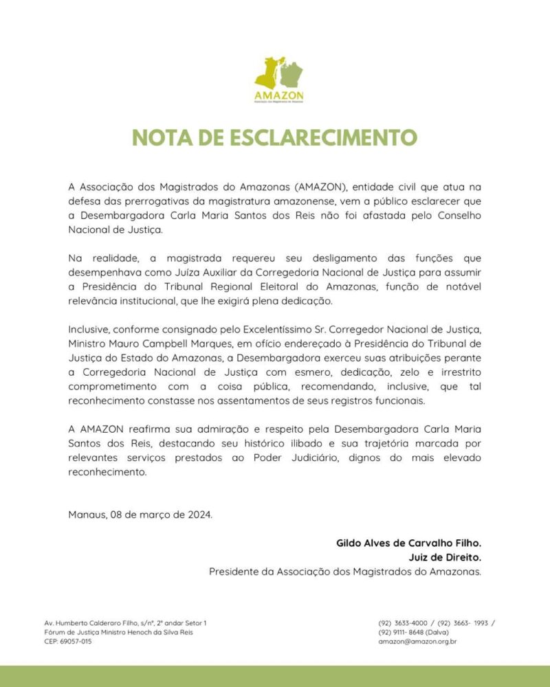 A Associação dos Magistrados do Amazonas (AMAZON) divulgou uma nota de esclarecimento informando que a desembargadora Carla Maria Santos dos Reis não foi afastada pelo Conselho Nacional de Justiça (CNJ). Segundo a entidade, a magistrada solicitou seu desligamento das funções de Juíza Auxiliar da Corregedoria Nacional de Justiça para assumir a Presidência do Tribunal Regional Eleitoral do Amazonas (TRE-AM).